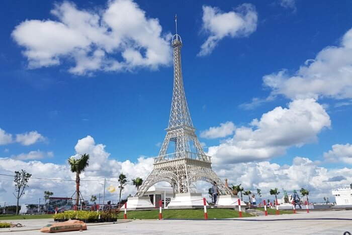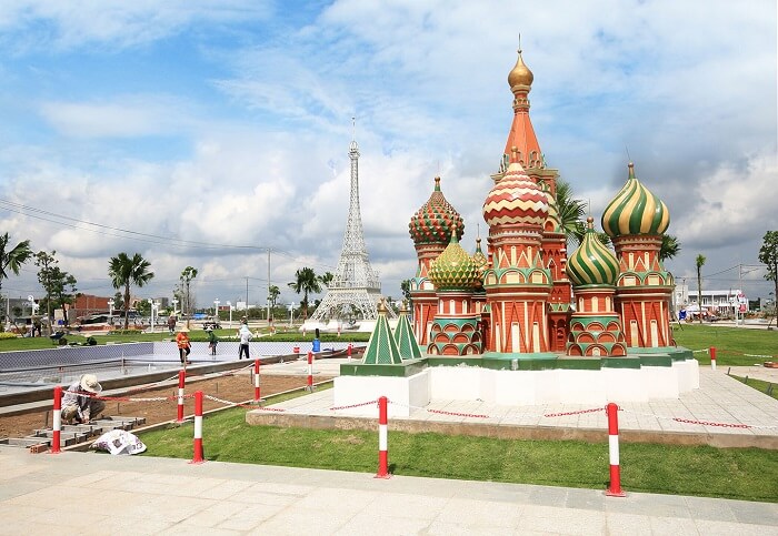 Đâu cần đi đâu xa, ngay tại khu du lịch sinh thái này, bạn vẫn có thể đi du lịch vòng quanh thế giới với các kỳ quan ấn tượng như: tháp Eiffel, biểu tượng của nước Pháp, tượng Nữ thần Tự Do đến từ nước Mỹ, nhà hát con sò của nước Úc hay tháp nghiêng Pisa Ý.