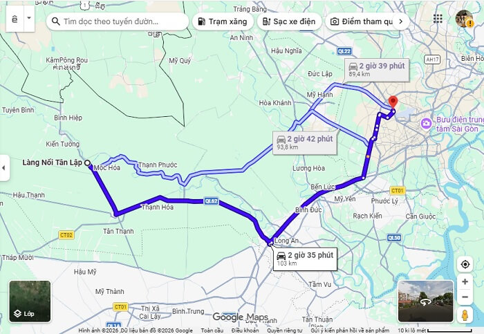 Tùy thuộc vào sở thích, nhu cầu và hoàn cảnh cụ thể, mỗi du khách có thể lựa chọn phương tiện là xe bus, xe máy hoặc ô tô. Dưới đây là bản đồ làng nổi Tân Lập với 2 cung đường phổ biến nhất nếu di chuyển bằng xe cá nhân.