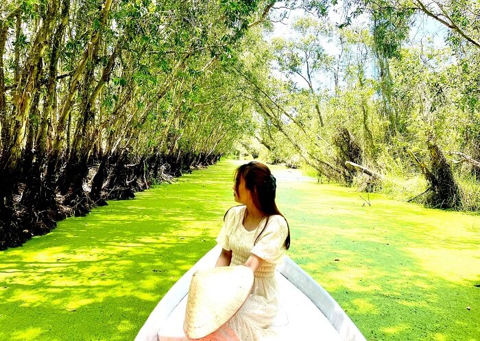 Giữa không gian thênh thang bao trùm bởi sắc xanh tuyệt đẹp từ những ngọn cây tràm, có một con đường nhỏ xinh hiện lên một cách mềm mại, uốn lượn qua những con kênh thơ mộng, vẽ nên một bức tranh thiên nhiên đơn sơ, mộc mạc.