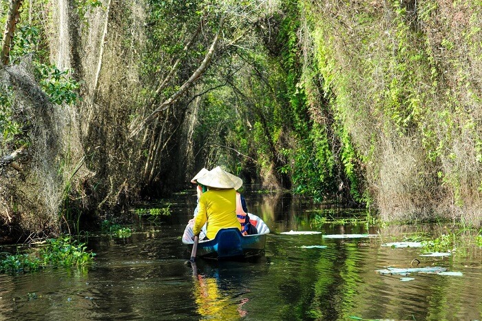 Không chỉ có con đường bê tông hiện đại, tham quan làng nổi Tân Lập còn có một phương tiện khác là xuồng ba lá. Những chiếc xuồng nhỏ sẽ đưa bạn len lỏi vào sâu trong rừng tràm, nơi những ngõ ngách mà chân người không tới được.