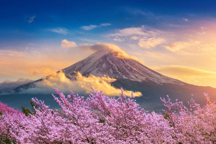 Núi Phú Sĩ (Nếu thời tiết đẹp, du khách sẽ được lên trạm số 5, ngắm nhìn đỉnh Núi Phú Sĩ lấp lánh chỏm tuyết bạc trong nắng hoàng hôn.): là đỉnh núi lửa đang hoạt động và cao nhất Nhật Bản, cao 3776m và bao quanh là 5 hồ nước. |