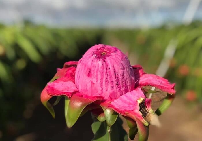 Đặc biệt, nếu đi vào thời điểm hoa nở, bạn sẽ được ngắm nhìn những đóa hoa thanh long trắng muốt, nổi bần bật giữa sắc xanh của biển thanh long rộng lớn.